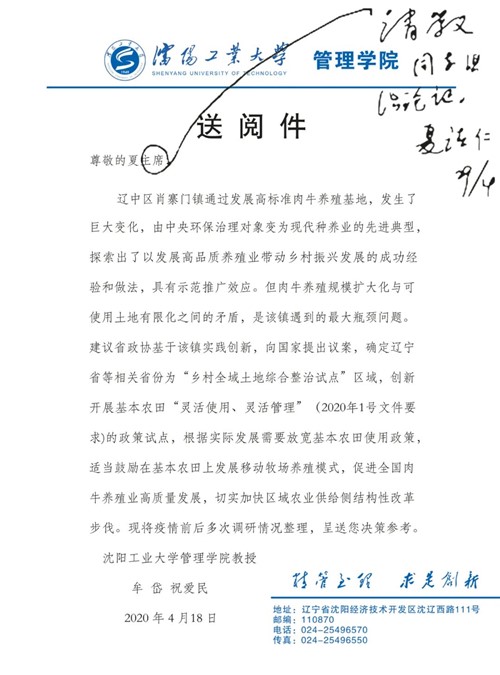 为深入研究国家提出创新开展基本农田“灵活使用,灵活管理”的要求,管理学院特聘教授牟岱和祝爱民院长从2020年初开始,多次深入我省农村基层开展调查研究活动,针对我省高品质肉牛养殖基地辽中区肖寨门镇大力发展种养结合过程中,在乡村全域土地综合治理过程中形成的管理经验和遇到的管理问题,进行了半年多的个案研究,形成了研究报告,提出了我省和国家在土地资源和产业发展管理问题上,应该根据实际发展需要放宽基本农田使用管理政策,适当鼓励在基本农田上发展移动牧场养殖模式,推动种养结合的生态循环经济,促进全国肉牛养殖高质量发展和种植业生态科学化发展,切实加快区域农业供给侧结构改革步伐。该报告得到了辽宁省政协夏德仁主席、沈阳市市长姜有为、沈阳市副市长王广生的重要批示,并组成省政协、环保厅、自然资源厅、省农科院、市政协等有关部门专家参加的联合调研组,进行了调研论证,肯定了种养结合的发展方向和肖寨门镇的可借鉴性的管理经验,并决定将肖寨门镇纳入明年的试点,进一步通过试点确定种养结合发展涉及到的土地管理、产业管理、生态管理、科技管理和人才管理的有关政策。