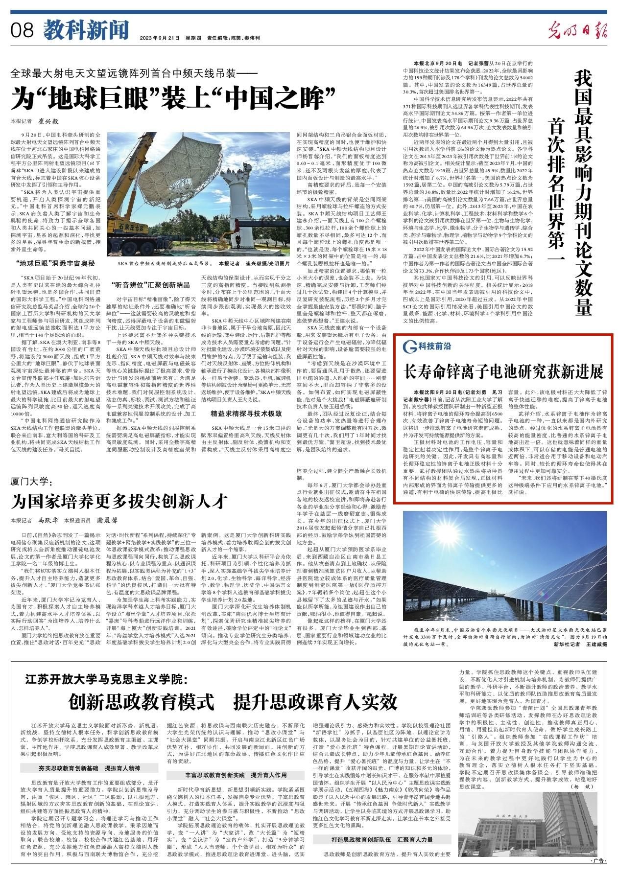 9月21日,《光明日报》以“长寿命锌离子电池研究获新进展”为题,报道了我校武祥教授团队研制一种新型正极材料,将锌离子电池的循环寿命提高到6500次,推动锌离子电池研究走向成熟,为开发可持续能源提供新的方案。